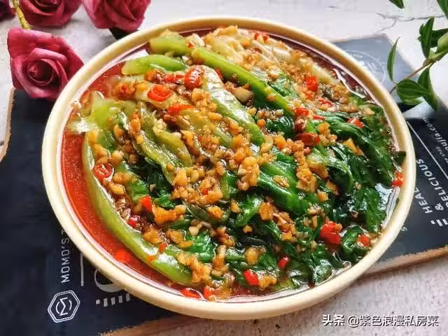 4.鍋內放油,放大蒜小米椒爆香,倒入碗汁燒開,將料汁澆在生菜上即可。