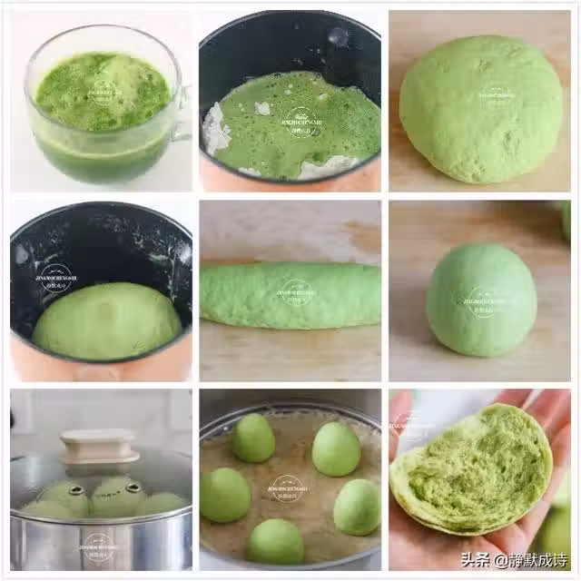 9、清新清香的黃瓜汁饅頭,黃瓜汁越濃,這個饅頭就越青翠,黃瓜味兒就越濃郁。