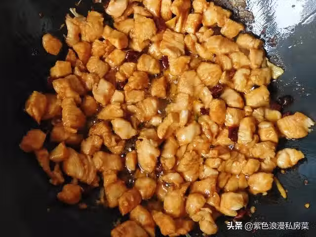 5.鍋中放油,放生薑,干辣椒爆香,放入雞丁,大火翻炒至斷生。