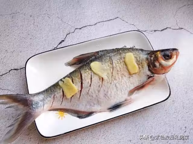 步驟一:準備食材,武昌魚去魚鱗,去鰓,去掉魚腹中的黑膜,魚背部兩面劃花刀,盤底放薑片,再放適量的鹽,一勺料酒,將魚全身抹均勻,腌20分鐘。