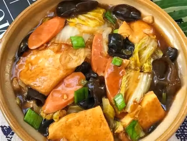 (4)鍋底留油爆香蒜末,下入白菜翻炒變軟,再加入黑木耳、火腿腸、嫩豆腐。