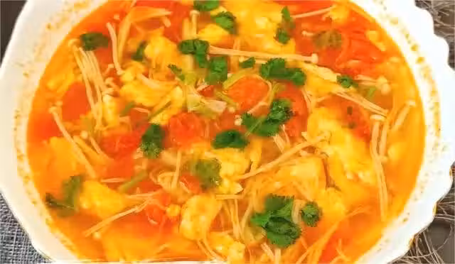步驟三:另加入番茄炒出沙,在加入適量的清水,煮開,加適量的生抽、鹽、胡椒粉,再加入金針菇、雞蛋,煮至入味即可。出鍋撒點香菜,味道更棒!酸爽開胃,夏天喝番茄湯太合適了!金針菇富含膳食纖維,幫助我們減肥瘦身。