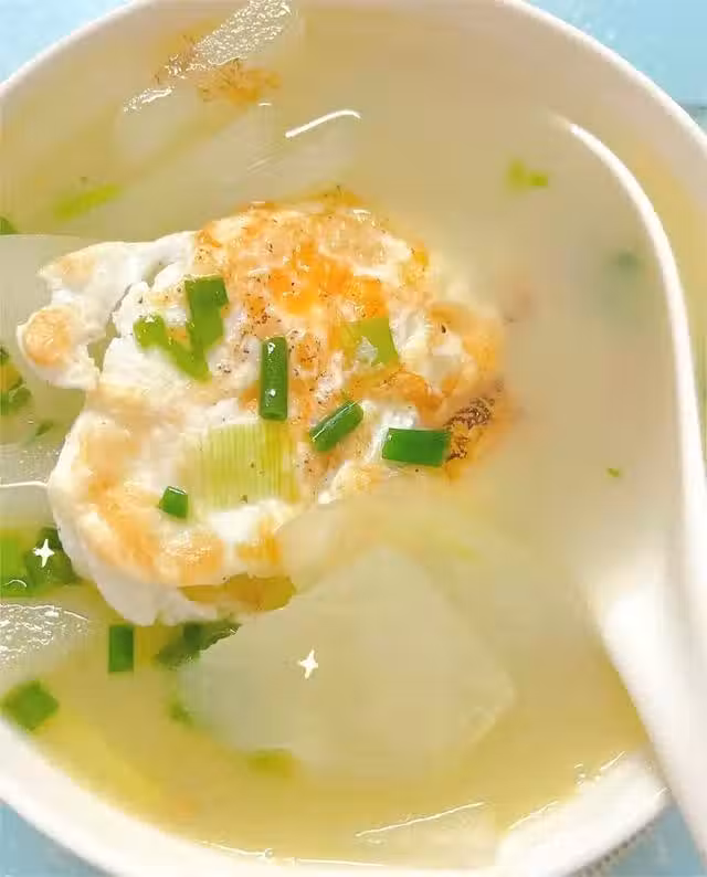 步驟三:鍋里留底油,加入薑絲炒香,加入冬瓜片炒一下,加入適量的清水,煮開後加入煎蛋,再煮三分鐘左右,加入胡椒粉、鹽調味,出鍋撒點蔥花。