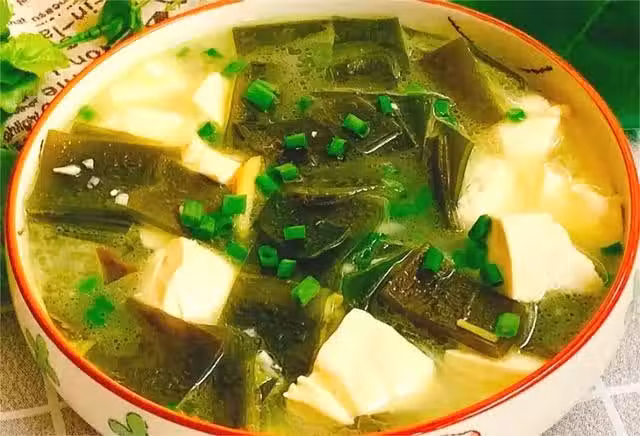 步驟二:鍋中加一點油,下入蔥、姜、蒜炒香,再下入海帶片,翻炒幾下,加入適量的水,煮開之後再加入豆腐塊,煮兩分鐘再加鹽、胡椒粉、雞精調味即可。海帶是典型的鹼性食物,營養豐富,熱量較低,富含膳食纖維,對於減肥瘦身很有幫助。