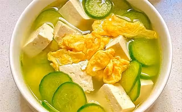步驟三:就著鍋里的一點油,再放入黃瓜片翻炒幾下,加入適量的清水煮沸,放雞蛋塊、豆腐塊繼續煮3分鐘左右,加適量鹽調味即可出鍋。