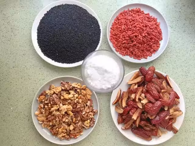 1、將所需要的食材一一稱重備好,開始製作前的準備工作,將阿膠塊包入棉布中敲成小塊,放入容器中倒入黃酒浸泡2天,如果是阿膠粉只需要浸泡24小時即可。生核桃放入烤箱中,上下火150度烤10-15分鐘即可取出來晾涼備用,黑芝麻放入炒鍋中小火炒至成熟晾涼備用,大棗去棗核後切成小塊備用,枸杞清洗乾淨後晾乾備用。