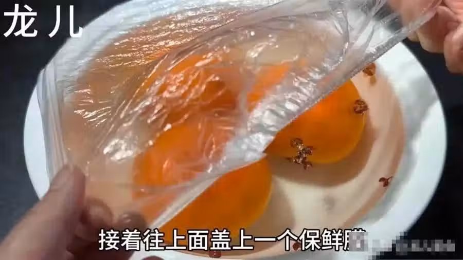 如果你做的懶柿子比較多的話,比如說五六斤,七八斤這樣子,我們就一定要準備一個大缸或者是大鐵盆,最後用大塑料薄膜將它蓋在上面,一定要讓柿子處於一個比較密封的狀態,這樣才能達到更好取色的作用。