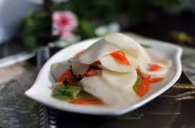 第一步,將山藥洗凈後,剝去皮,用斜刀切成薄片,加入一匙白醋浸泡在清水中10分鐘,取出,用清水沖洗,然後瀝干水。