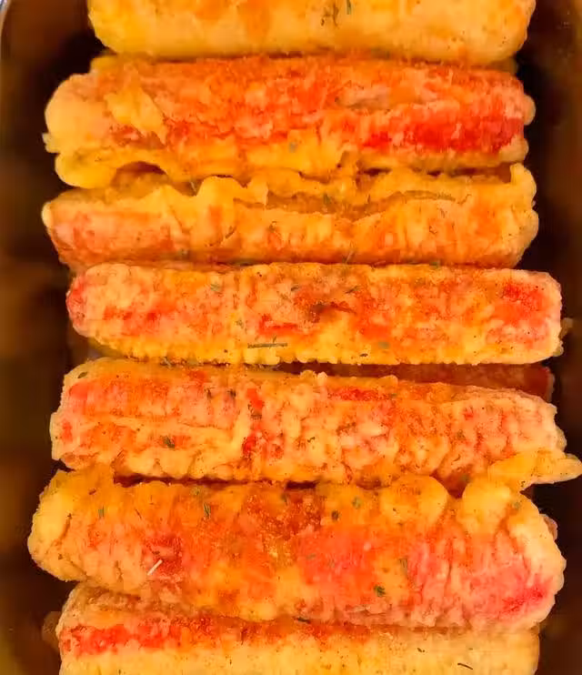 步驟三:鍋中燒油,把蟹柳棒一個一個下鍋炸,炸至金黃,撈出即可。搭配自己喜歡的醬料吃就可以了。