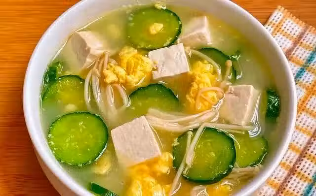 食材準備:黃瓜,豆腐,金針菇,雞蛋,鹽,胡椒粉等。