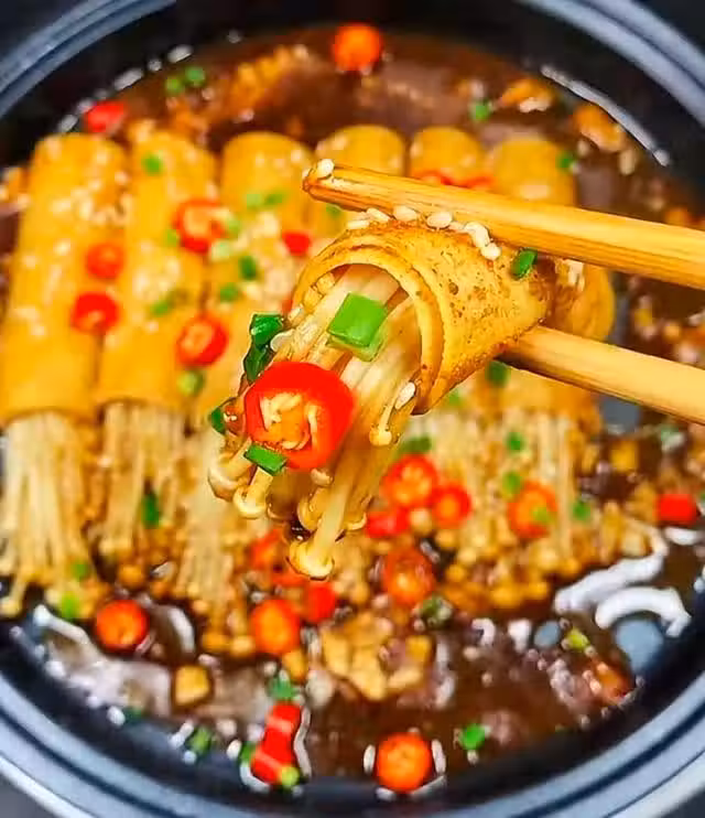 步驟三:鍋中燒油,把蒜末炒香,再把豆皮卷放進鍋中,倒入調好的料汁,咕嘟至入味,熟透再撒點芝麻、小米辣、蔥花即可出鍋。