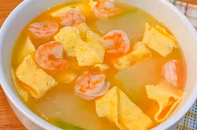 步驟三:起鍋燒油,倒入蝦仁炒至變色,倒入兩碗清水燒開,加入冬瓜片,煮熟後放入雞蛋條,加適量鹽調味即可出鍋。
