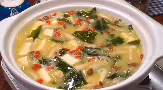 這道湯煮出來的湯汁濃白,味道鮮美,加了一點菌菇,味道會格外鮮美。鯽魚中的蛋白質被充分地煮出來,很好吸收,搭配了富含大豆卵磷脂和蛋白質的豆腐,富含鈣質的裙帶菜,富含維生素和礦物質的菌菇,這一鍋喝起來十分地鮮美。