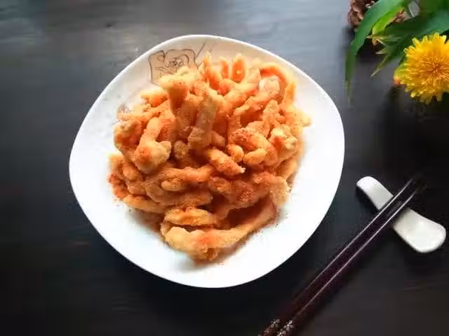 5.升高油溫,下入雞柳復炸,炸至外表金黃,酥脆,撈出瀝油,放在盤內,撒上椒鹽和辣椒粉即可
