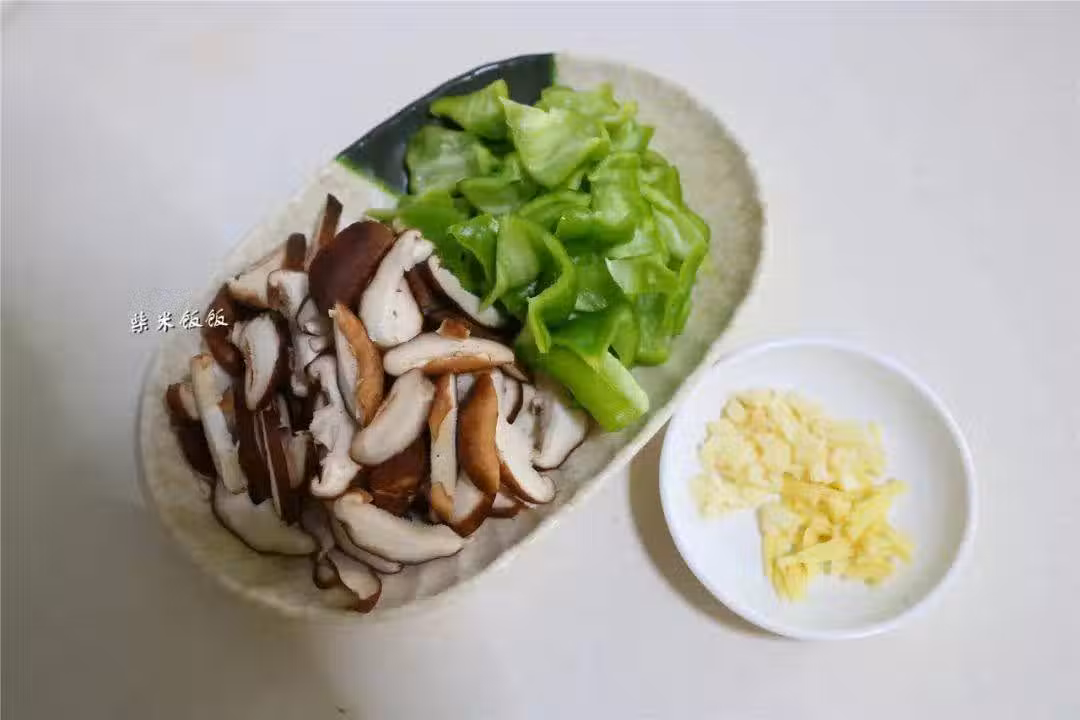 3,香菇洗凈,攥干水分後切成片。青椒一個,去籽去蒂後切成小塊。