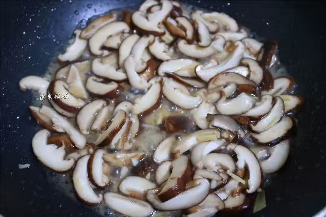 5,倒入切好的香菇,大火炒軟。香菇的菌菇氣味比較重,如果不習慣這個味道,可以把香菇開水下鍋焯燙一下再炒,菌菇味會輕很多。