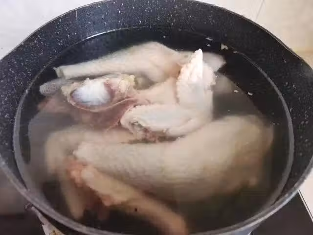 2.鍋中燒水,把雞肉冷水入鍋,然後在鍋中加入1勺料酒去腥,然後煮至沸騰。