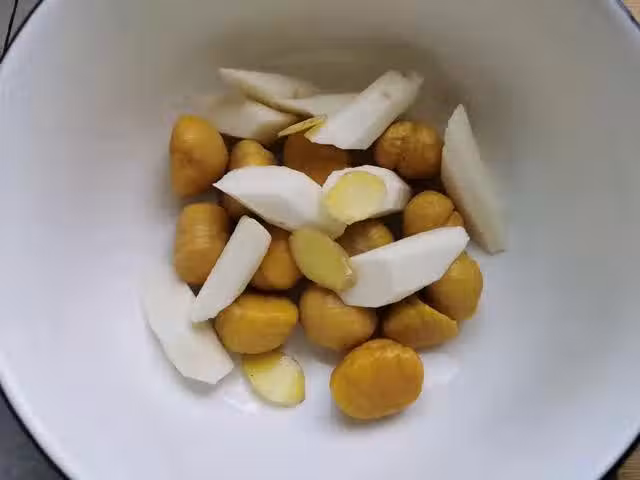 7.然後把山藥用削皮器削皮,山藥削皮一定要戴上手套,否則手會不舒服,然後把山藥切成段,然後把生薑切片。