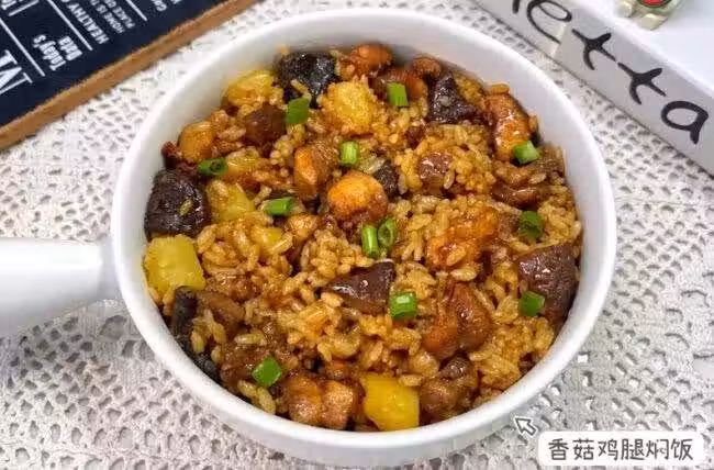 2、香菇、馬鈴薯切塊,大米洗凈放入電飯煲,加入香菇馬鈴薯,倒入雞腿肉,再加入平時燜米飯的水量,按煮飯鍵煮熟即可。