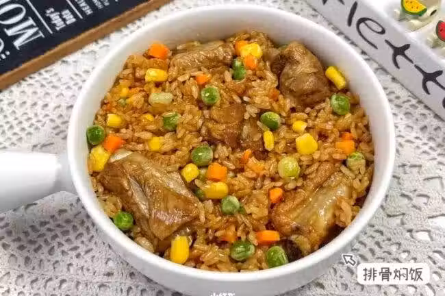 食材:排骨、胡蘿卜粒、青豆、玉米粒、大米