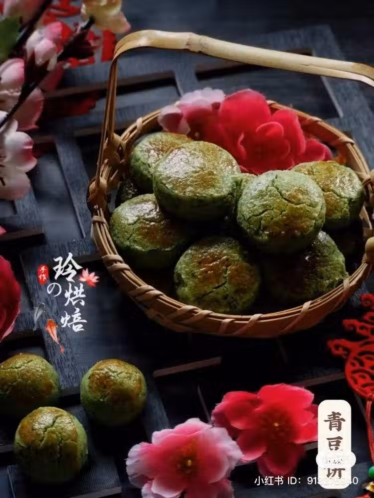 材料:中筋麵粉500g、青豆粉500g、糖粉300g、芥末青豆180g、花生油350ml、鹽 1茶匙、蛋黃2顆