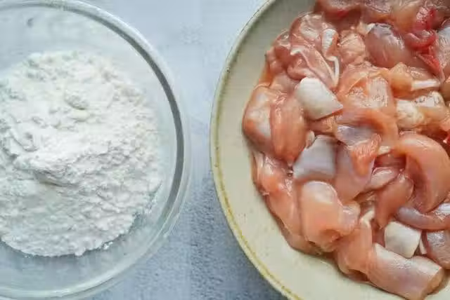 時間到了之後準備一小碗麵粉,把每塊雞肉都均勻的沾上麵粉。