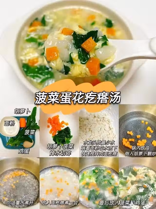 做法:胡蘿ト、菠菜切丁,雞蛋打散備用,熱鍋放油下胡蘿ト翻炒,加水煮開,放麵疙瘩煮熟,放入適量鹽、十三香,最後放入雞蛋和菠菜即可。