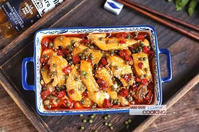 食材:三黃雞半隻,藤椒1大把,干辣椒1小把,醬油2大勺,蚝油2大勺,胡椒粉2克,鹽2克,料酒2勺,薑片4片,蒜末適量,辣椒油適量