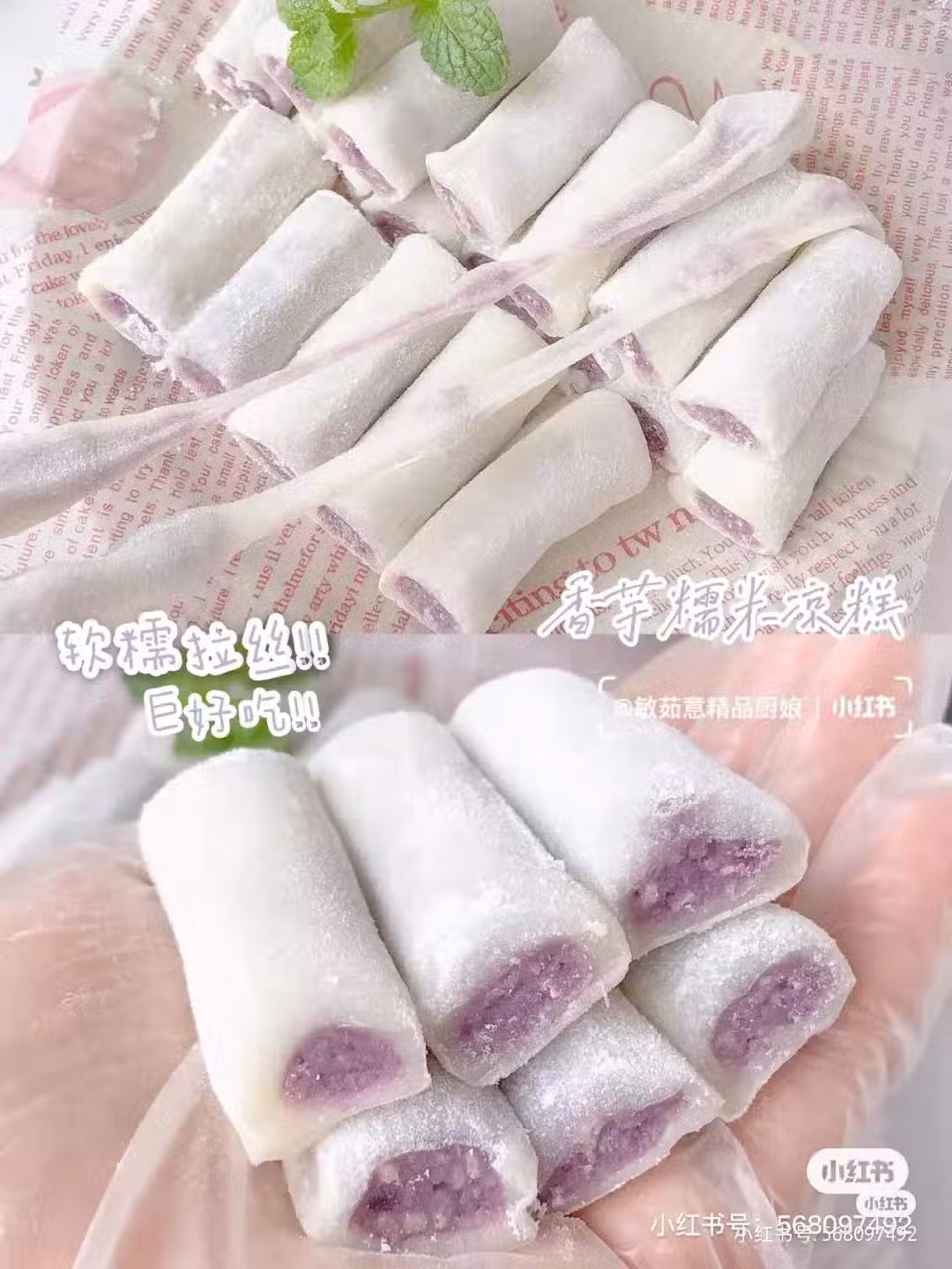 1.】糯米粉玉米澱粉白糖拌勻牛奶調勻成糊狀過濾到蒸碗裡,打保鮮膜開水上鍋蒸20分鐘,蒸好趁熱加黃油攪拌均勻,不燙手時帶手套揉成光滑麵糰