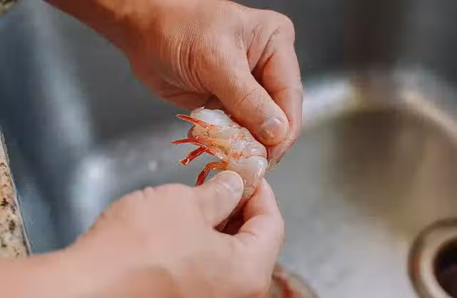 把雞蛋打入到碗中用筷子打散,把培根片切成長度和蝦一樣長,把洋蔥洗凈後用刀切成洋蔥絲,接下來我們來處理一下大蝦,把蝦頭掰掉,然後小心的把蝦皮從蝦身上剝掉。
