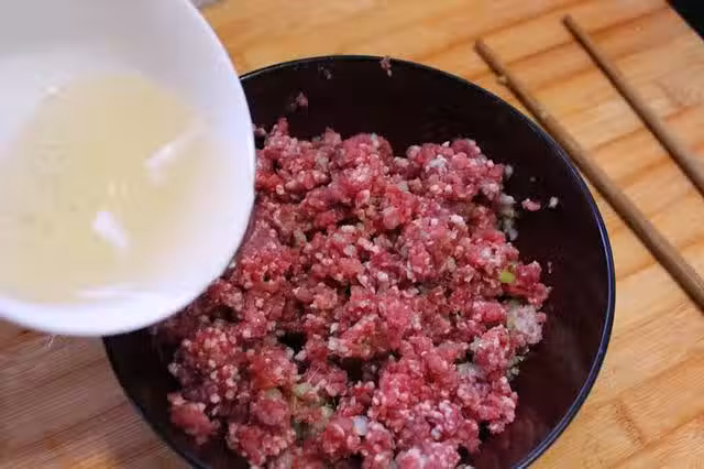 少量多次的將提前泡好的花椒水倒進肉餡,水倒進之後朝一個方向攪拌,一直攪拌到肉餡攪拌起來比較費勁,呈粘稠狀之後再繼續加花椒水,我加了差不多大半碗左右,花椒水能夠有效的去除肉的膻味,還能讓肉質吃起來更加的鮮嫩。