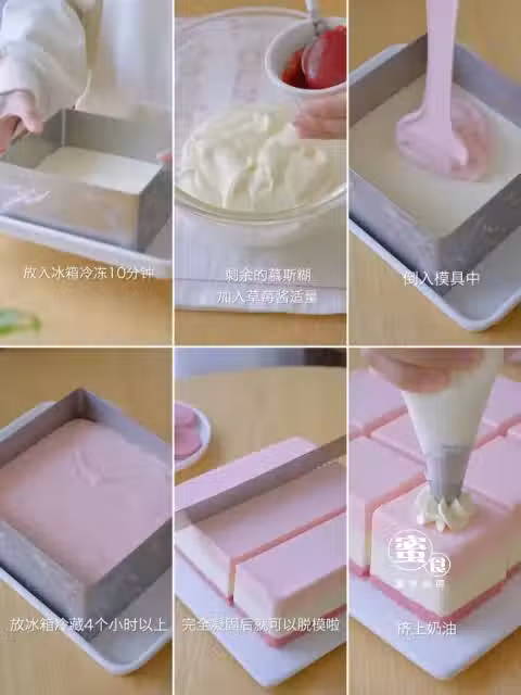再剩下的慕斯糊裡面加入草莓果醬,倒入模具中冷藏四個小時以上。