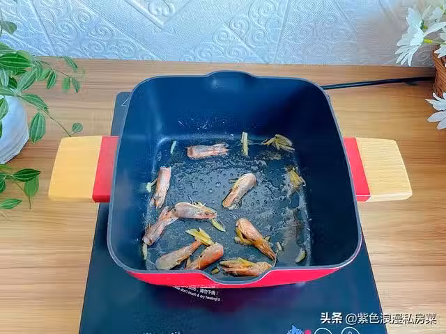 5.鍋中再放少許油,放薑絲,放蝦頭炒出蝦油。