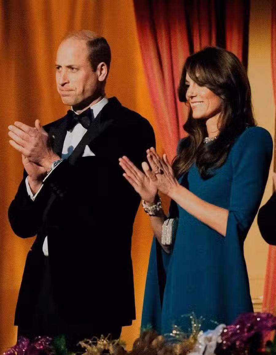 凱特王妃參加皇家演出,穿孔雀藍高墊肩水袖拖地晚禮服,驚艷登場