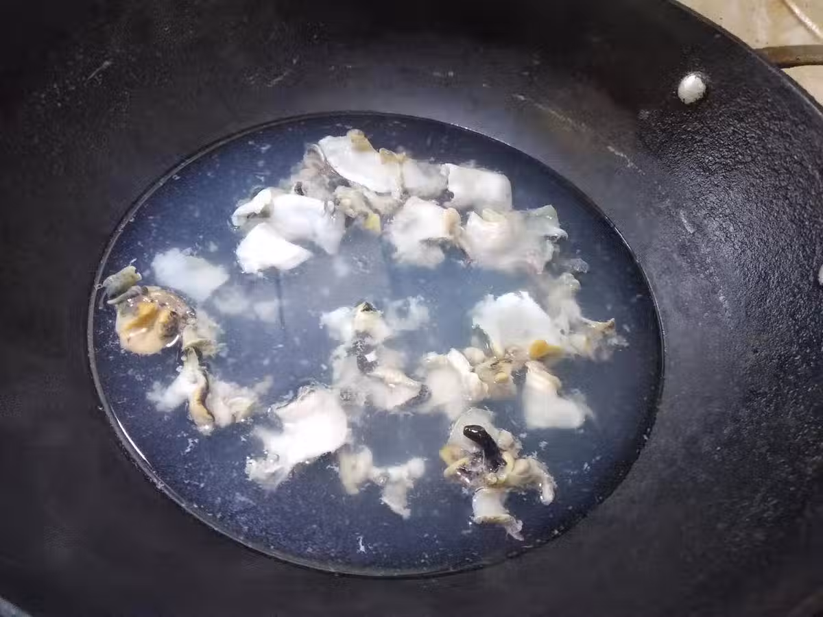 4.海螺片的清理和烹制:海螺砸碎後取肉,只取螺頭部分加入鹽和醋搓洗去粘液,然後從嘴部開刀片開平拍一下,把海螺片成片,鍋中水燒開後端離火口,把海螺片入鍋焯燙至打卷後迅速撈出過涼,然後再進行爆炒或熗拌都可以,這樣可以保證螺片的爽脆口感。
