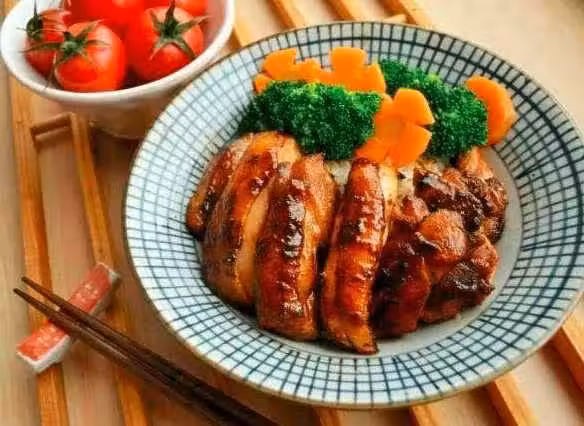 和米飯一起擺盤,再澆上照燒醬,撒上少許白芝麻,擺上配菜,照燒雞腿飯就可以開吃啦!