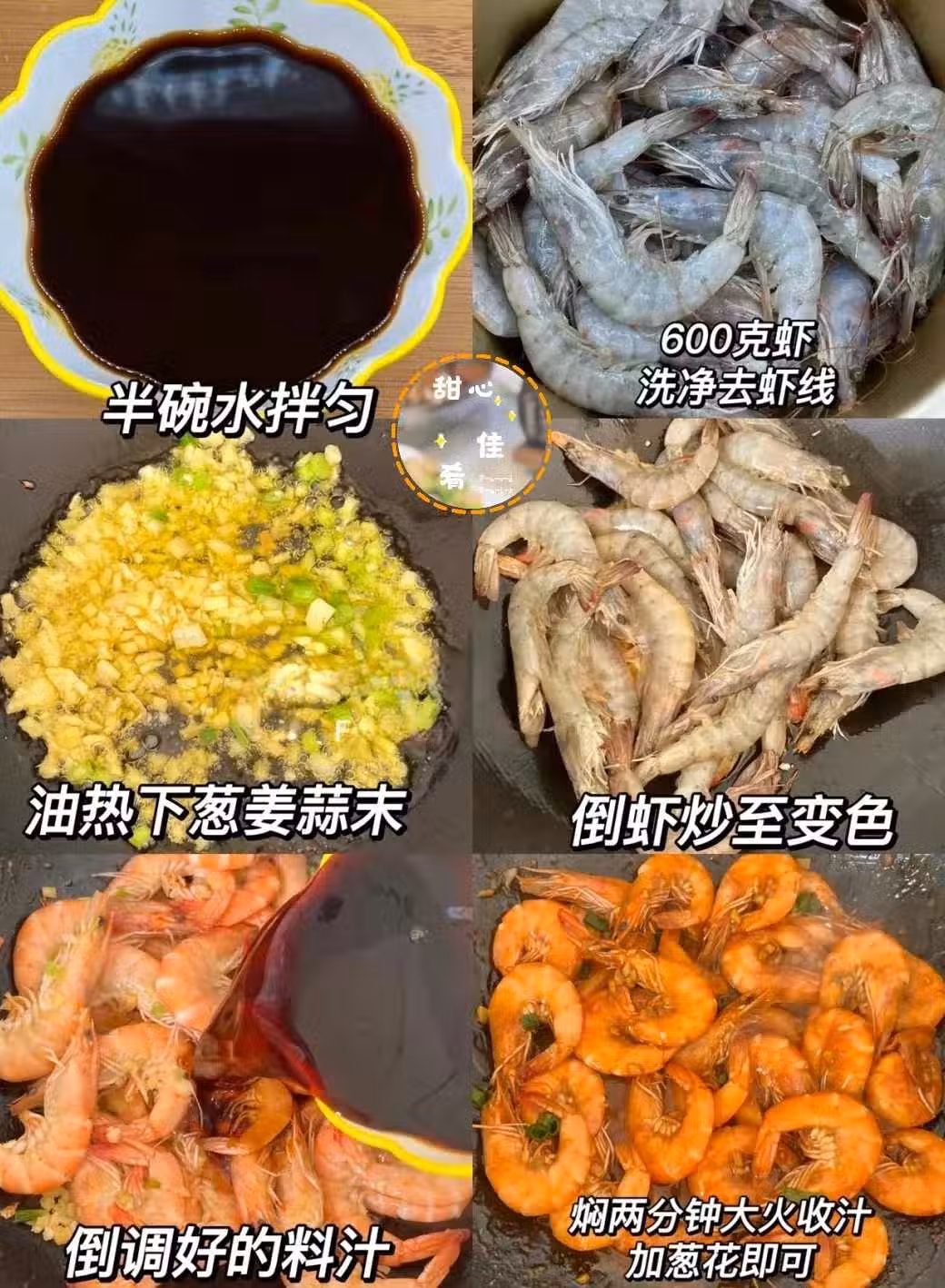 蔥姜蒜炒香,倒蝦炒至變色,倒調好的