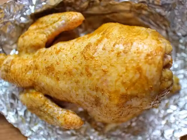 6、此時烤箱預熱200度上下火,我們將雞用錫紙完全包裹住,一定要包裹著烤,這樣烤出來的雞嫩些。等烤箱預熱好後,送入烤箱中層,上下火200度,烤1小時25分鐘,烤好後再悶五分鐘。