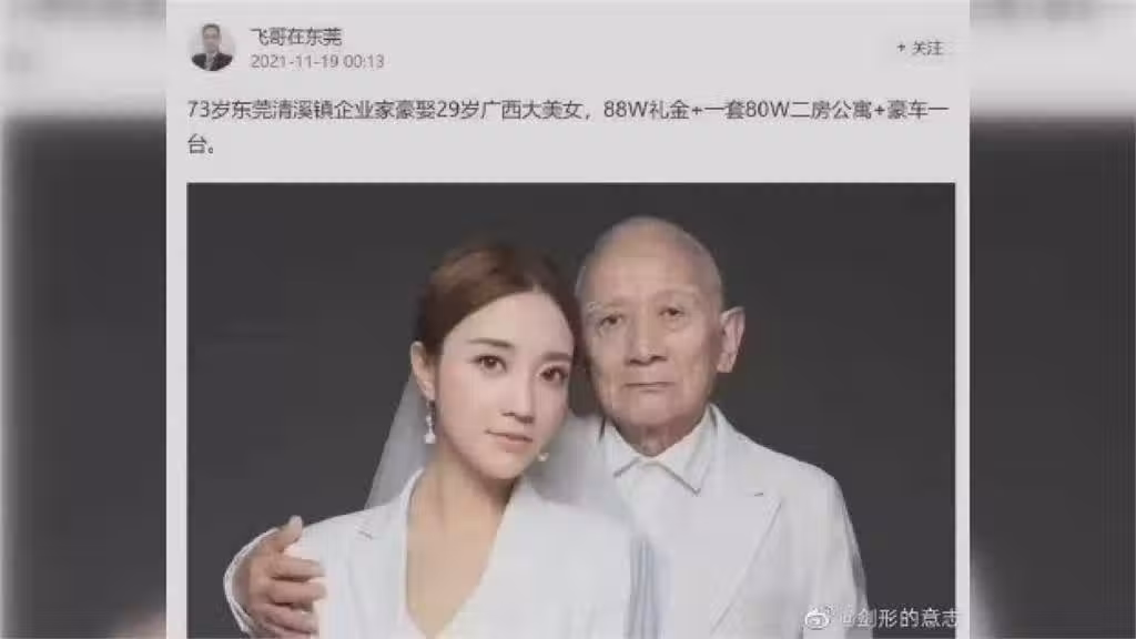 根據今日新聞報導,化名為「飛哥在東莞」的網友爆料,有一位73歲的企業家富豪擲千金迎娶29歲的正妹網紅,不僅大手筆花了人民幣88萬的禮金,再外送一套80萬人民幣的兩房公寓配上一輛豪車,隨後更是附上兩人一看就有非常明顯年齡差距的婚紗照,讓許多人乍看之下都第一時間往「有年輕美女為了錢嫁給富豪」的方向猜想!畢竟照片中可以看到妙齡網紅挽著高齡的西裝男子,並面露幸福開心的表情,看起來確實有那麼一點像是即將新婚的甜蜜夫妻。
