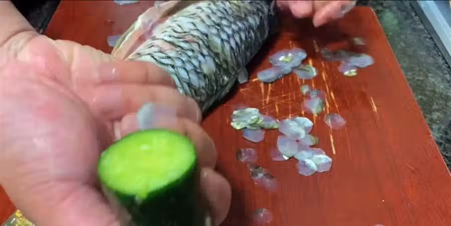 以黃瓜為例,切完以後,用黃瓜刮魚鱗,從尾部開始,向頭部慢慢刮,這樣就可以輕松去掉魚鱗。被刮下來的魚鱗會堆積在一起,不會弄得四處飛濺,收拾起來很容易。只不過這種方法可能會傷害魚皮,影響美觀性!