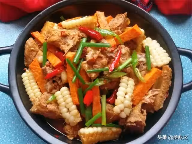 7、糯玉米放入,翻炒勻燉兩滾兒。