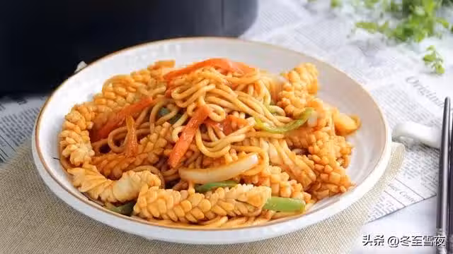 【魷魚蔬菜炒麵】所需材料:鮮麵條4兩、鮮魷魚2條、胡蘿蔔1/2根、洋蔥1/3個、尖椒2個、姜1塊、大蒜2瓣、料酒1湯匙、番茄醬1湯匙、醬油1湯匙、