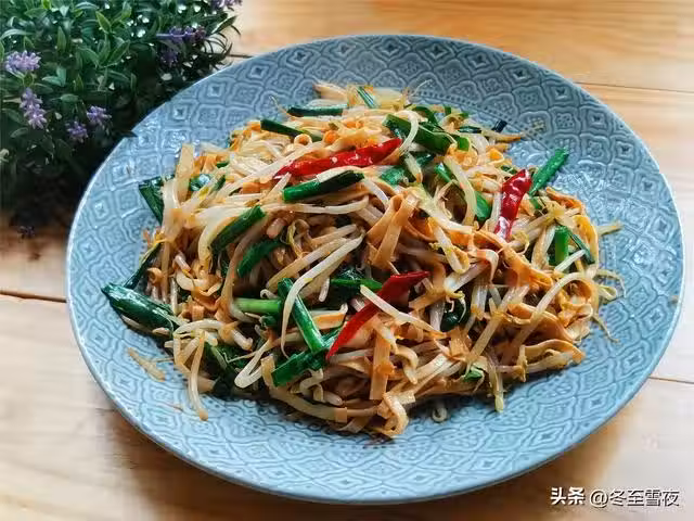 【素炒三絲】所需材料:綠豆芽400克、干豆腐(豆皮)2張、韭菜1把、油鹽適量、姜2片、大蒜2瓣、雞精1茶匙、