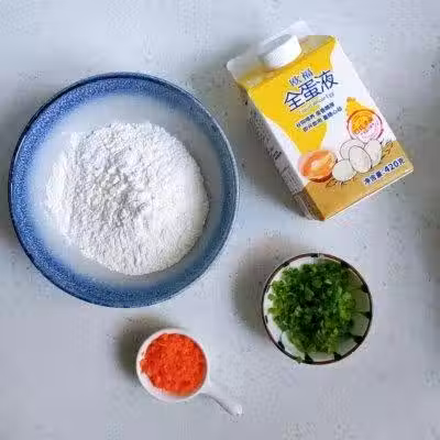 1、150克低粉(用低粉做出來比較軟)、210克歐福全蛋液、3根香蔥洗凈切成蔥花(不要蔥白)、胡蘿蔔或者火腿腸切丁備用。