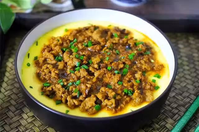 5、把蒸好的雞蛋羹取出,再把炒好的牛肉末鋪在上面,就可以了。
