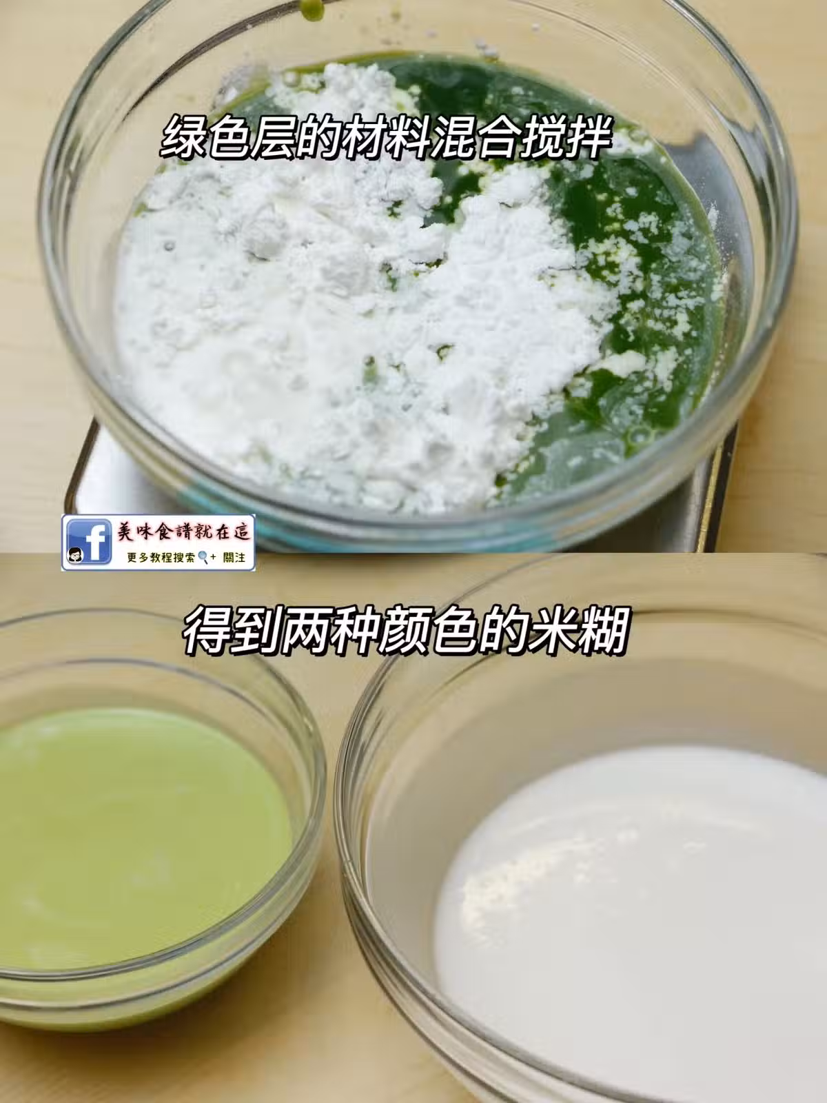 4.蒸製:取適量米糊,倒在平盤上,大火蒸1分鐘左右,直到米糊凝固即可。倒入等量的另外一種顏色的米糊,蒸熟後重複以上步驟,以此類推將兩種顏色的層次交替疊加。