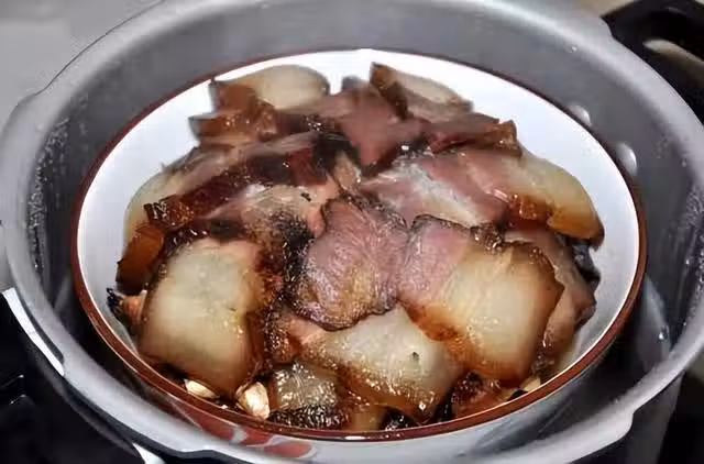 3.炒鍋燒熱放入食用油。油熱後放入臘肉給它大火炒出油脂。油脂炒出來後在裡面加入蔥姜然後放入準備好的小米辣。沒有小米辣的朋友也可以放點泡椒。