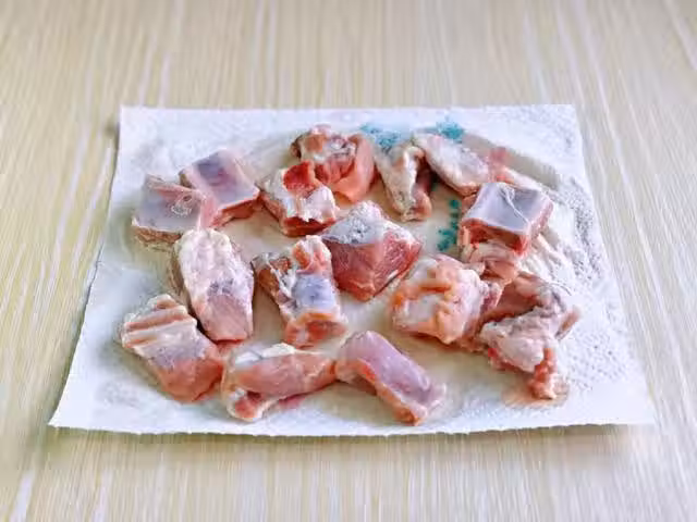 6、擦乾水分的排骨放在盤子裡面,撒上蔥花和薑片。