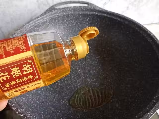 5、將鍋準備好,現在需要加火,目的是為了將鍋中的水分蒸發乾,將一開始準備的花生油倒入鍋中,不要太多,因為肉中也有一定量的油,如果油太多,會太膩的,這時候需要繼續用到火,慢慢的鍋中的油熱了,就可以進行下一步了。