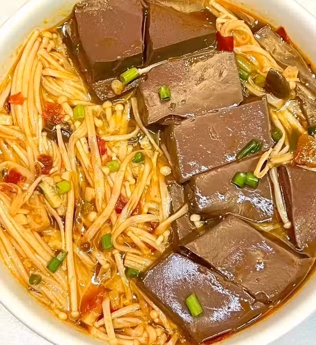 1.金針菇洗凈去除根部,鴨血切成大塊,小蔥切蔥花,大蒜切末。
